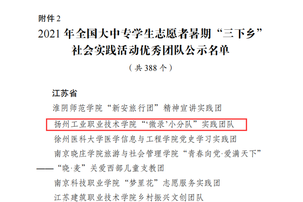 近日,共青团中央青年发展部揭晓了2021年度“三下乡”社会实践优秀团队公示名单,遴选出388个“三下乡”社会实践优秀团队。我校“‘微录’小分队”实践团队荣获2021年全国大中专学生志愿者暑期“三下乡”社会实践活动优秀团队,弥补了我校暑期社会实践在全国奖项的空缺。