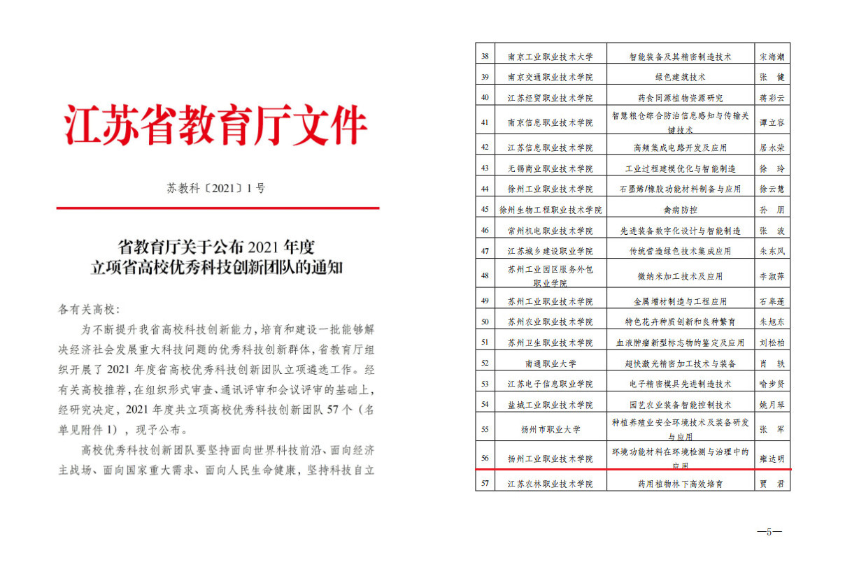 近日,江苏省教育厅印发了《关于公布2021年度立项省高校优秀科技创新团队的通知》(苏教科〔2021〕1号),我校化学工程学院雍达明博士领衔的“环境功能材料在环境检测与治理中的应用科技创新团队”获批立项。这是我校继2017年之后获批的第3个江苏省高校优秀科技创新团队,获批团队总数位居全省高职院校前列。