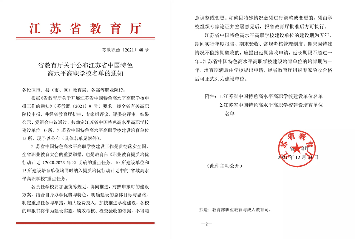 2021年12月31日,江苏省教育厅发布《关于公布江苏省中国特色高水平高职学校名单的通知》(苏职教函〔2021〕48号),公布了10所江苏省中国特色高水平高职学校建设单位和15所江苏省中国特色高水平高职学校建设培育单位。我校以优异成绩入选江苏省中国特色高水平高职学校建设单位。