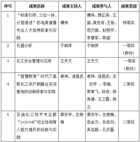 近日,中国化工教育协会发布了《关于公布第六届中国石油和化工教育教学成果认定结果的通知》,我校再创佳绩,获教育教学成果特等奖1项、一等奖(教材)2项、二等奖2项。