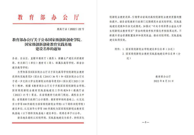 2022年8月31日,教育部办公厅发布了《关于公布国家级创新创业学院、国家级创新创业教育实践基地建设名单的通知》(教高厅函〔2022〕22号),我校成功入选“国家级创新创业实践基地”建设单位。