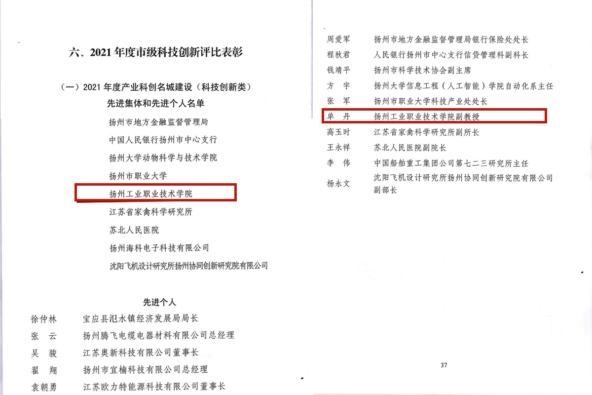 近日,扬州市委市政府公布2021年度产业科创名城建设先进集体和先进个人名单,我校被表彰为新兴科创名城建设先进集体,我校单丹老师被表彰为新兴科创名城建设先进个人。