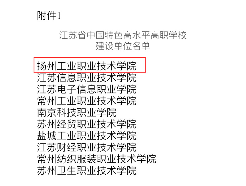 2021年12月31日,江苏省教育厅发布《关于公布江苏省中国特色高水平高职学校名单的通知》(苏职教函〔2021〕48号),公布了10所江苏省中国特色高水平高职学校建设单位和15所江苏省中国特色高水平高职学校建设培育单位。我校以优异成绩入选江苏省中国特色高水平高职学校建设单位。
